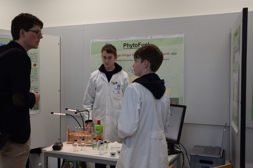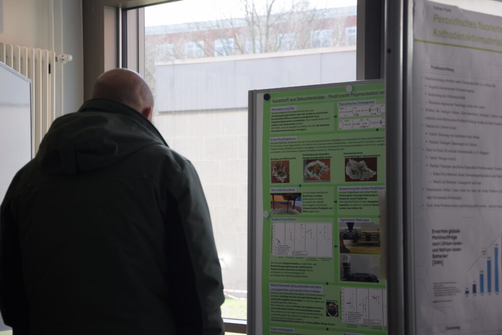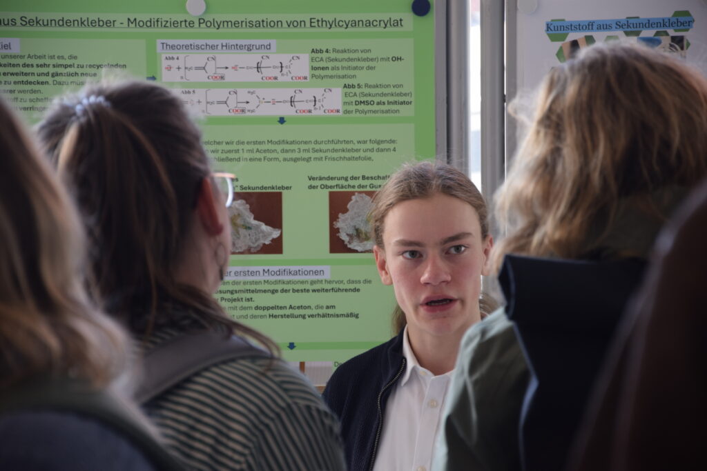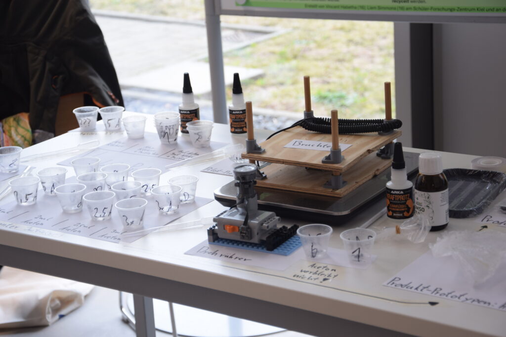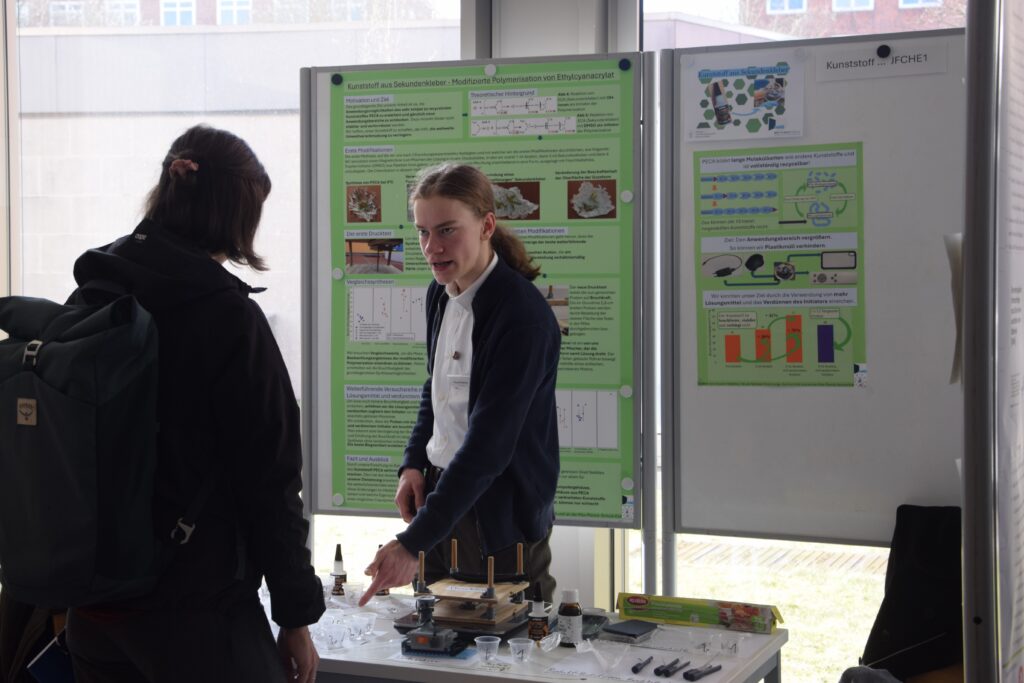 Ein weiterer Landessieg ging an Vincent Habetha (17) und Liam Simmons (16) von der Max-Planck-Schule Kiel/Schülerforschungszentrum Kieler Forschungswerkstatt. Mit ihrem Projekt „Kunststoff aus Sekundenkleber – Modifizierte Polymerisation von Ethylcyanacrylat“ treten sie im Fachbereich Chemie im Bundefinale an. Krankheitsbedingt leider nicht antreten konnte Paul Dubberke (16), Dahlmannschule Bad Segeberg/Schülerforschungszentrum Segeberg.