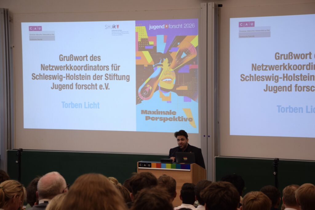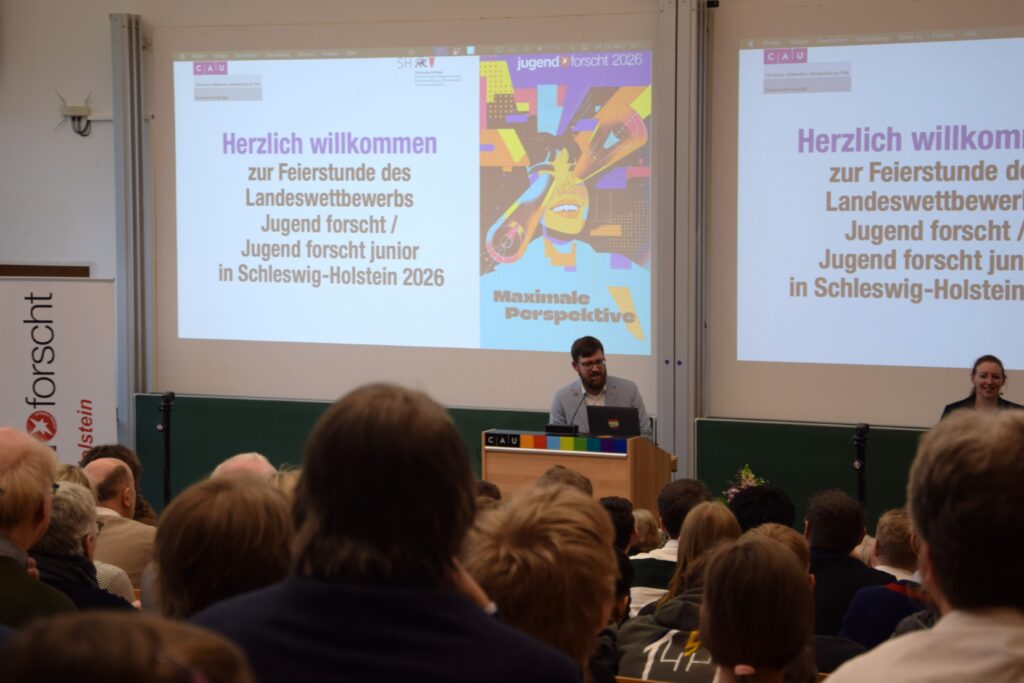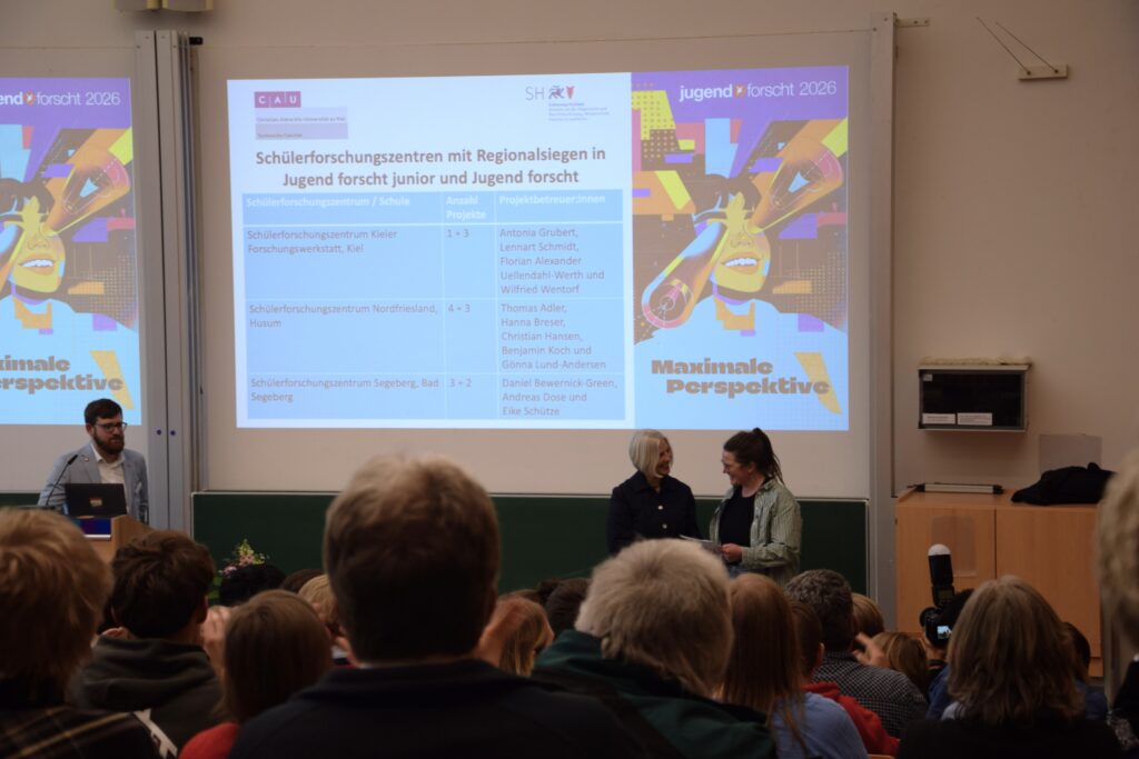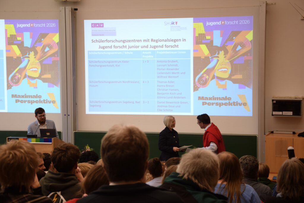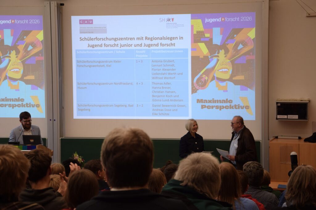 Am Mittwoch, 25. März, fand an der Kieler Universität der schleswig-holsteinische Landeswettbewerb Jugend forscht statt. Die Schülerforschungszentren Schleswig-Holstein (SFZ-SH) waren mit insgesamt 16 Projekten beim Wettbewerb vertreten. Bei der Preisverleihung freuten sich die Schüler*innen über großartige Platzierungen und auch die SFZ-Betreuer*innen erhielten wieder verschiedene Auszeichnungen. Für drei Projekte geht es vom 28. bis 31. Mai 2026 beim Bundeswettbewerb in Herzogenaurach in die finale Wettbewerbsrunde.