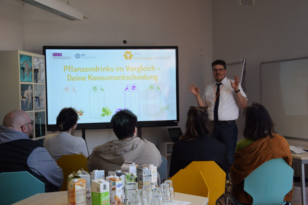 Im Rahmen von Science Comes To Town (SCTT) hat sich die Kieler Forschungswerkstatt ein besonderes Angebot überlegt: Jeden vorletzten Donnerstag im Monat öffnet das Lehr-Lern-Labor seine Türen für die Öffentlichkeit. Los ging es am 23. April 2026 mit dem food:labor. Von 17 bis 19 Uhr waren alle Interessierten herzlich eingeladen, einen Einblick in das Programm zu Pflanzendrinks und Konsumentscheidungen zu erhalten.