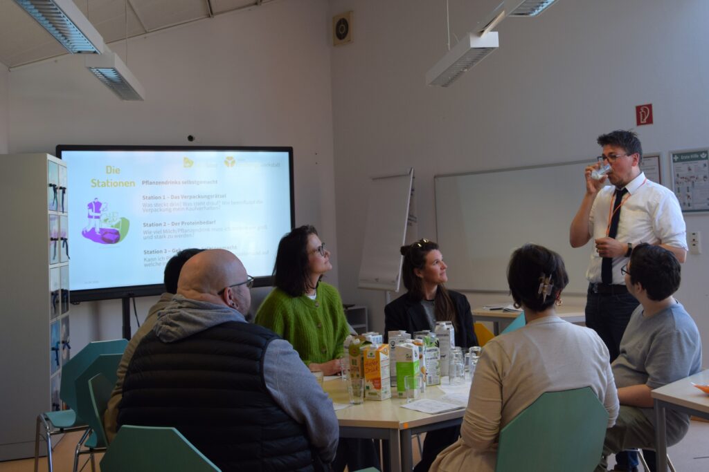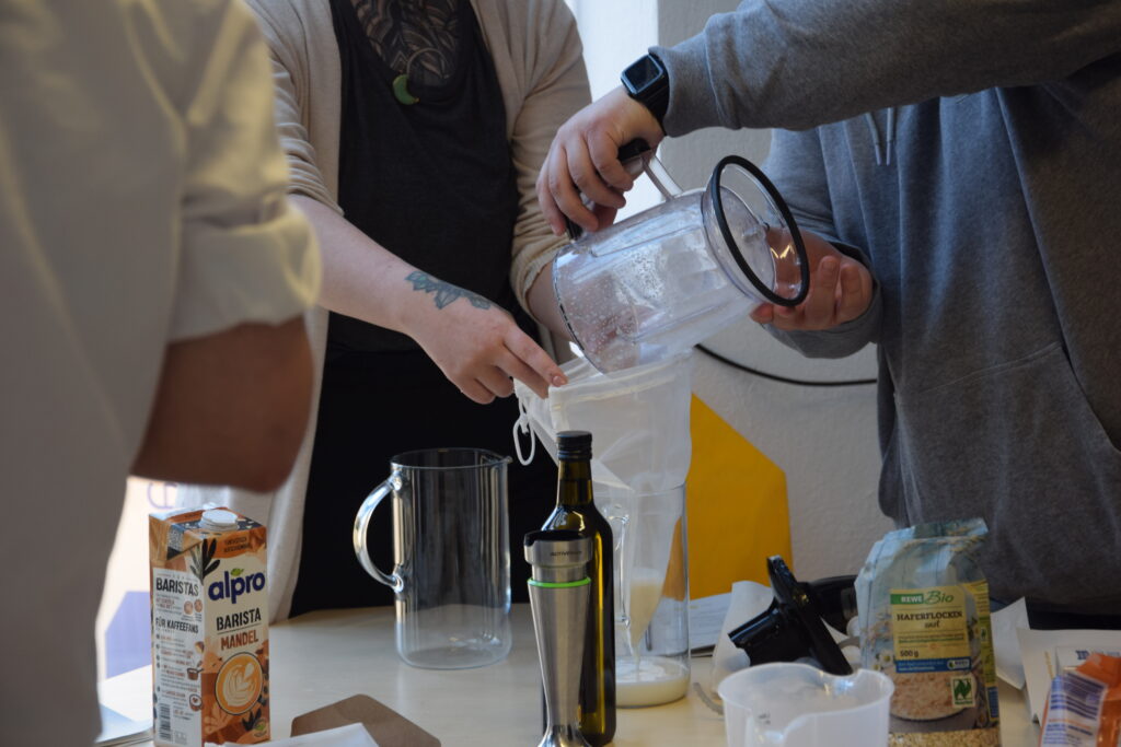 Was beeinflusst eigentlich unsere Entscheidung beim Kauf von Lebensmitteln? Warum greifen wir manchmal zu dem einem Produkt und beim nächsten Mal zu einem anderen, wenn wir vor dem Supermarktregal stehen? Und wie steht es eigentlich um die ökologische Bilanz von Drinks aus Soja, Hafer und Co? Genau solchen Fragen gehen die erwachsenen Teilnehmerinnen und Teilnehmer an diesem Tag auf den Grund. Außerdem stellt die Gruppe gemeinsam mit dem Team vom food:labor im Labor auch Pflanzendrinks selbst her und untersucht deren Inhaltsstoffe mithilfe eines Photometers. Diese Laborarbeit ist sonst nur Schulklassen vorbehalten. Auch testen die Teilnehmenden den Geschmack und den Preis der verschiedenen pflanzlichen Alternativen zur Kuhmilch.