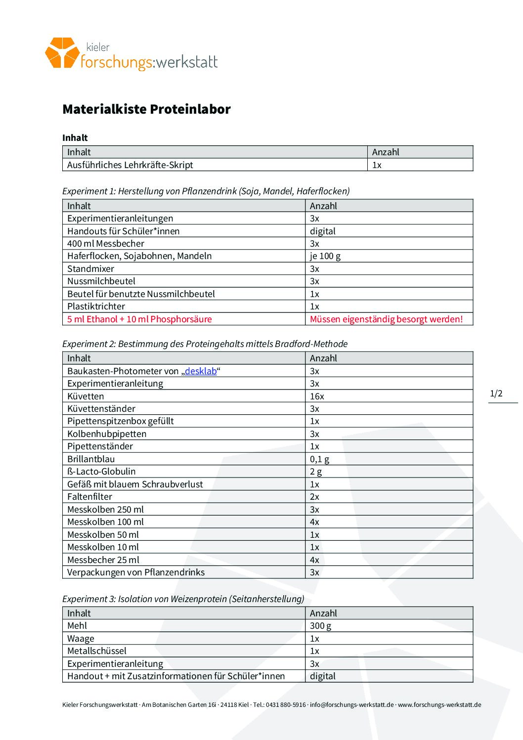Das food:labor verleiht Materialien für drei Experimente zum Thema Proteine. Diese eignen sich für die Sekundarstufe 2, sind in Abwandlung aber auch mit jüngeren Lerngruppen durchführbar. Maximale können 24 Schüler*innen gleichzeitig mit dem Inhalt einer Materialkiste arbeiten. Insgesamt stehen drei Kisten zum Ausleihen zur Verfügung.